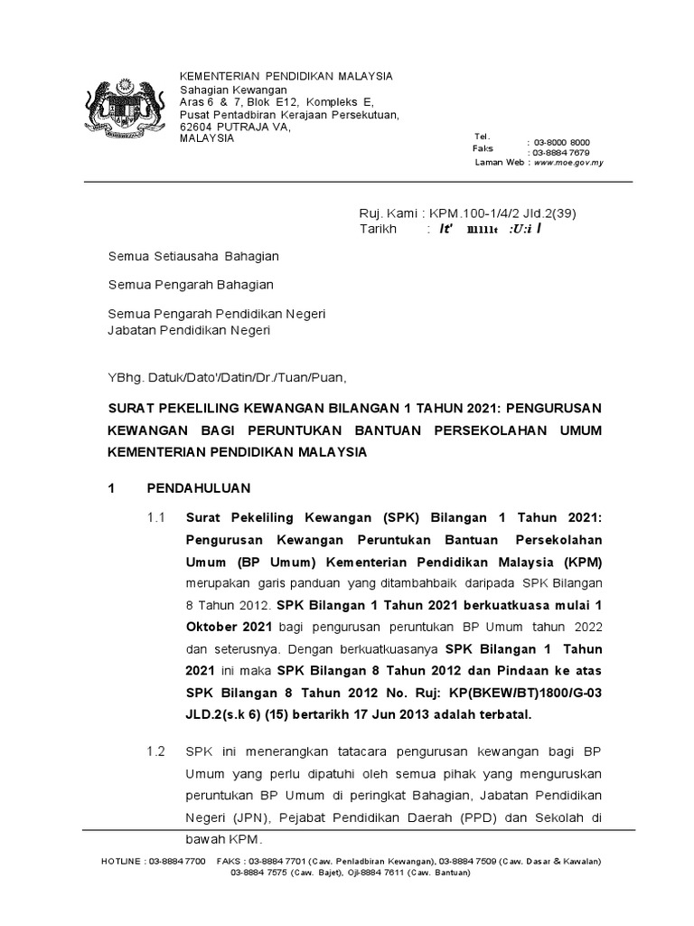 Spk Bilangan 1 Tahun 2021 Pengurusan Kewangan Bagi Peruntukan Bantuan Persekolahan Umum Kementerian Pendidikan Malaysia Pdf
